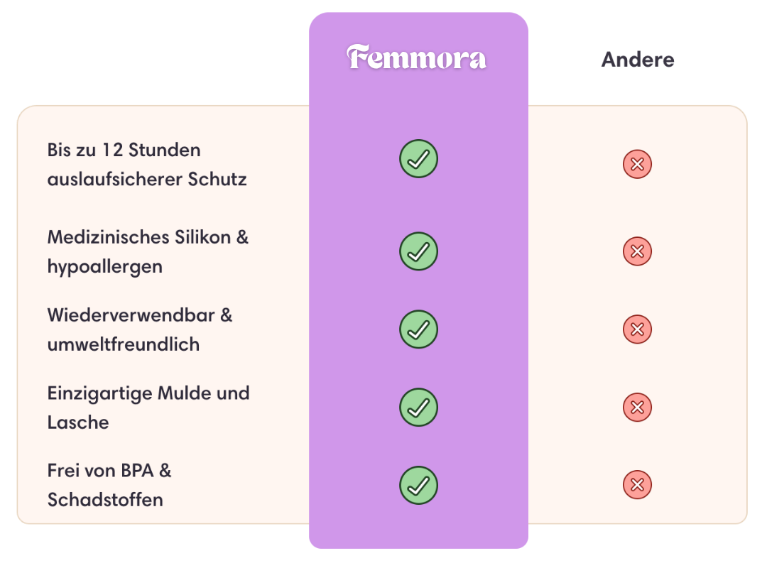 Wenn du während der Verwendung der wiederverwendbaren Femmora schmerzhaftes oder schwieriges Wasserlassen oder eine Unfähigkeit, deine Blase vollständig zu entleeren, feststellst, setze die Verwendung sofort aus und konsultiere deinen Arzt.